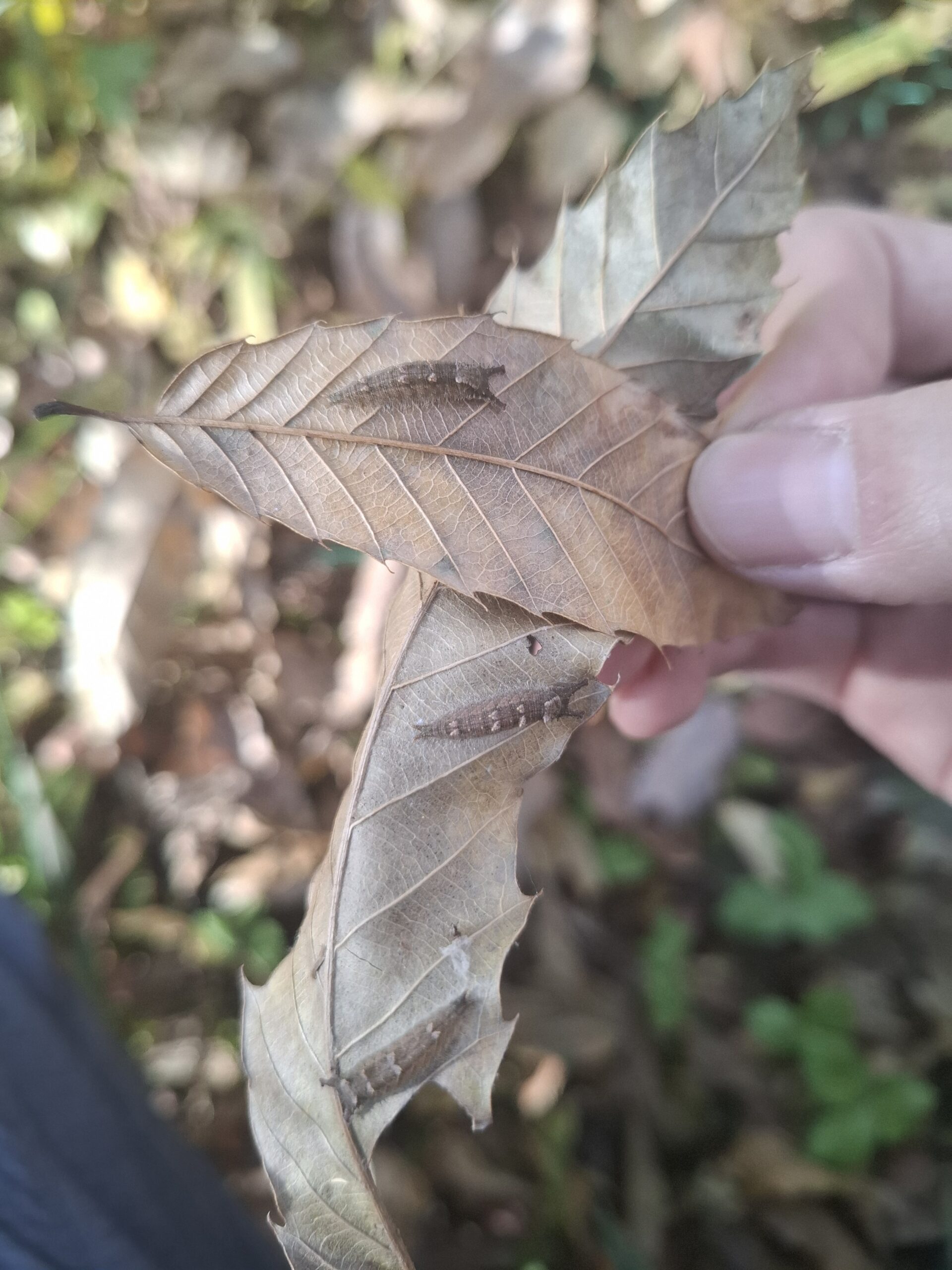 里山の木々も葉を落とし、オオムラサキたちも冬を越すために木から降りてきました。 根元に溜まった落ち葉の裏にはりつき、来年の春までじっと寒さをしのぐ日々です。 冬眠中のオオムラサキの幼虫をご覧になりたい場合は、私達職員にお声掛けください。
